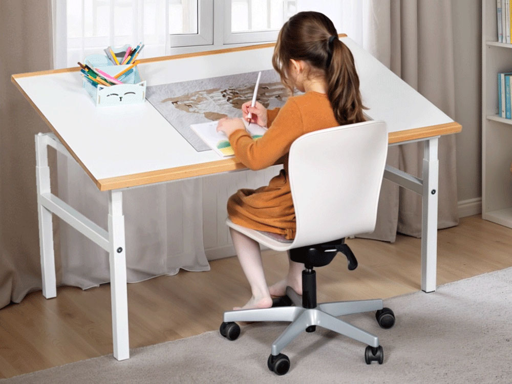 Wichtig sind eine stabile, pflegeleichte Arbeitsfläche, Schubladen für Stifte, Bastel- und Malzeug, eine ergonomische Höhenverstellung sowie eine gute Beleuchtung, am besten mit Tageslicht. Auch eine schrägstellbare Platte kann sinnvoll sein.